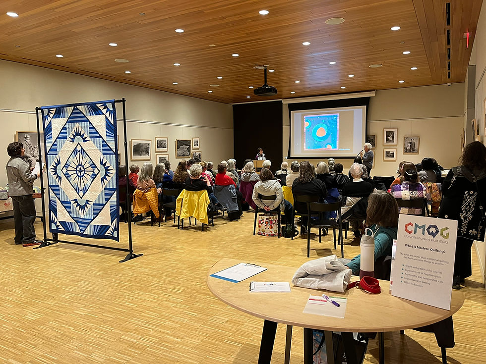 The March 12, 2026 meeting of the Corvallis Modern Quilt Guild (CMQG) was conducted at the Corvallis Museum. Colleen P., President, convened the meeting at 7:00 p.m. Susan S. graciously welcomed forty-four attendees (3 guests and 41 members) to the evening meeting.
